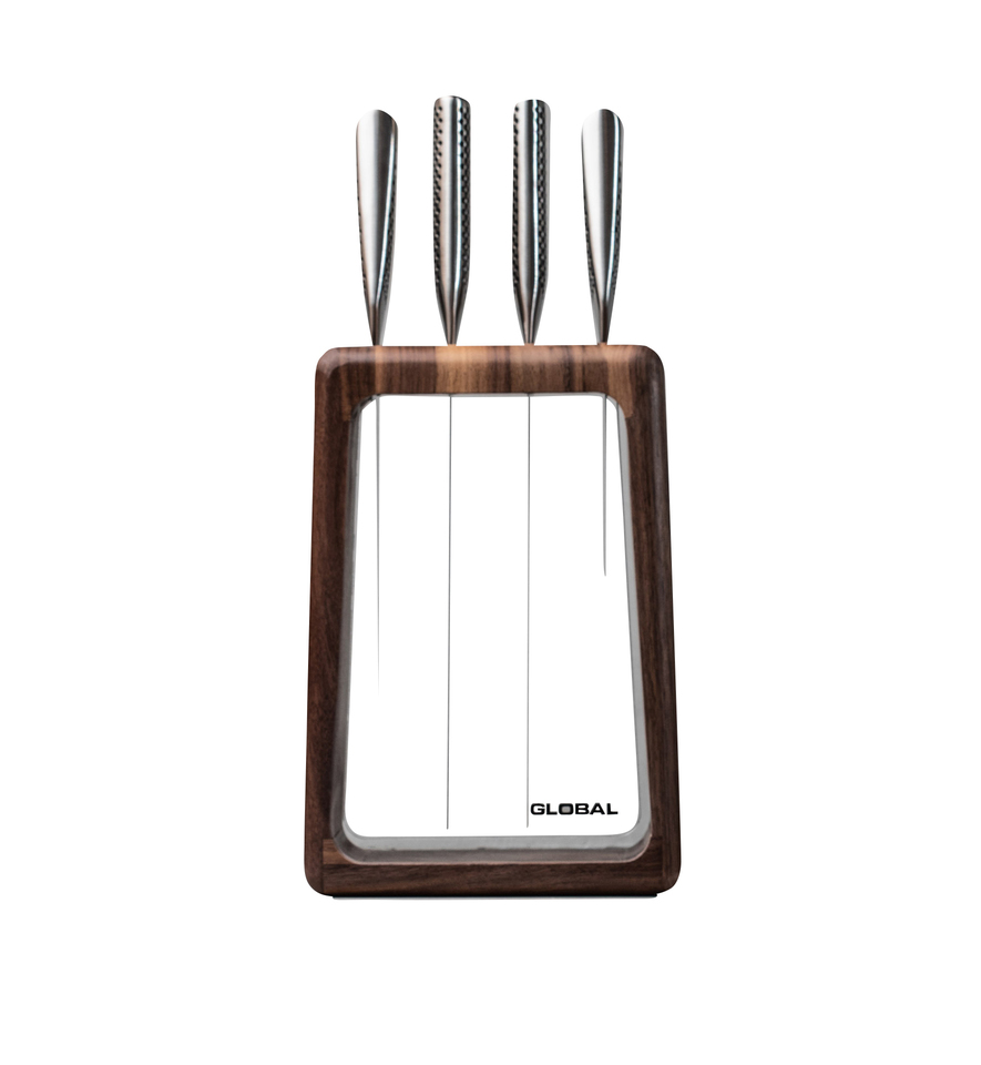 The 5 Piece HASHIRA® Knife Block set includes the 4 must have knives, all housed in an elegant walnut storage block. This knife block features a clear acrylic window at the front which not only allows your knife to be stored safely, but also allows the knife blades to be on display in the kitchen. GLOBAL knives are made from CROMOVA 18 stainless steel, specially developed by GLOBAL as it holds a razor-sharp edge and resists rust, stains and corrosion. Ice tempered and hardened to Rockwell C56-58, each knife is carefully weighted for optimum performance and balance. Other unique features include its smooth contours and seamless construction which eliminates food and dirt traps offering the ultimate in safety and hygiene. The acute 15-degree angle cutting edge provides unsurpassed performance and superior edge retention. The name HASHIRA (R) translate to "Pillar" in Japanese as the storage block resembles a vertical structure which supports the knives. When purchasing any GLOBAL® knife block set, we strongly recommend investing in a ceramic water sharpener or whetstone in order to maintain your knives and keep them razor sharp.